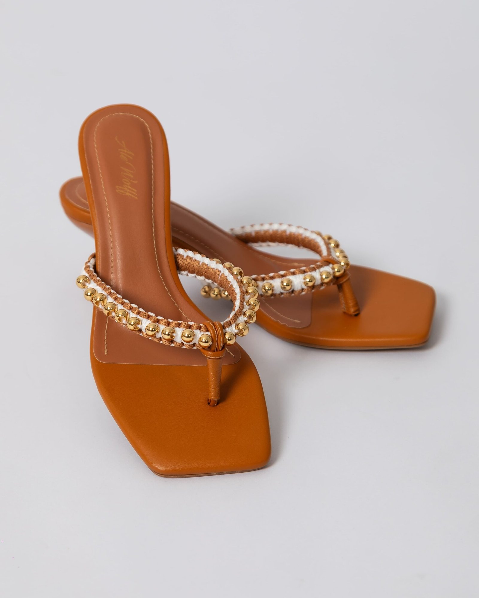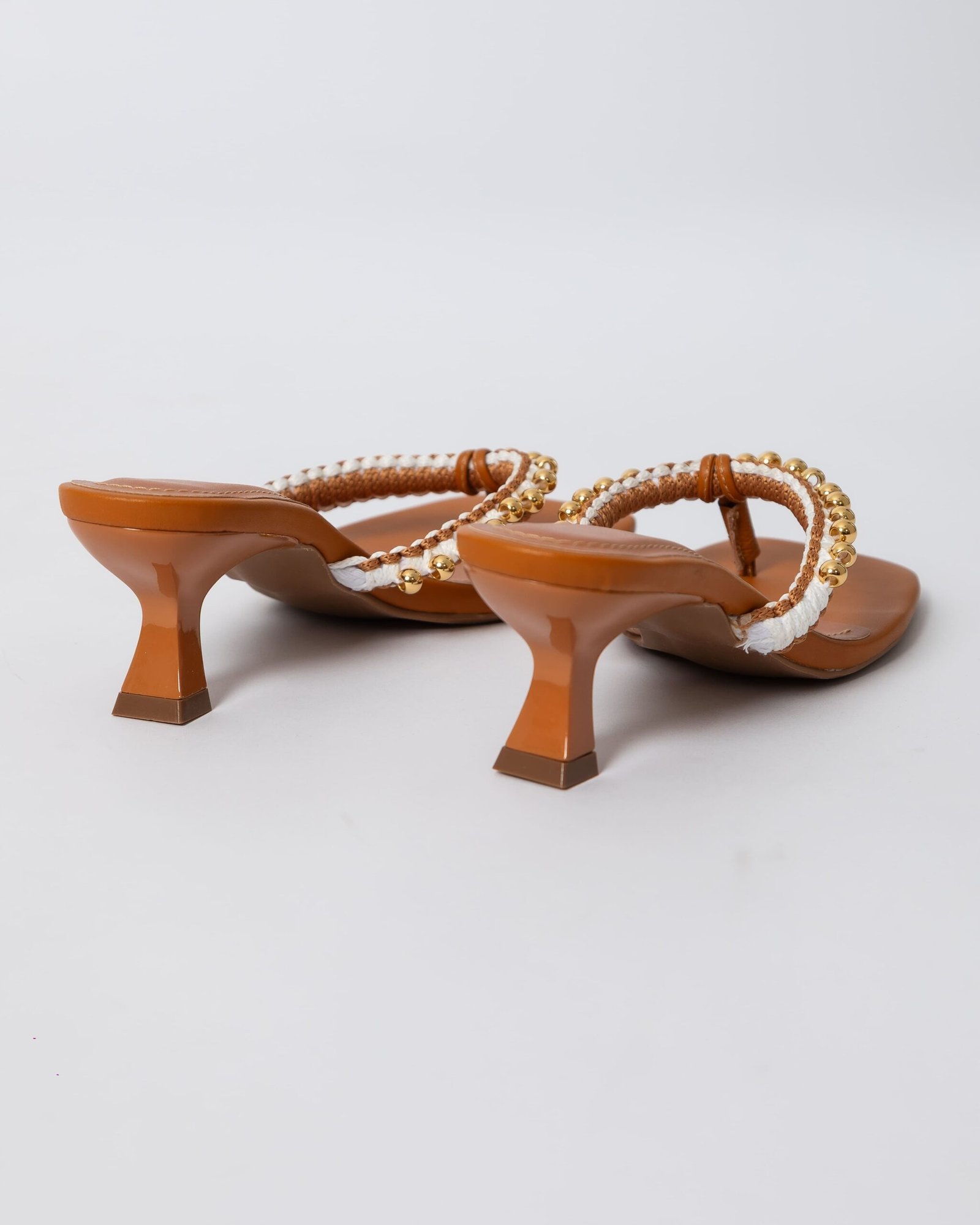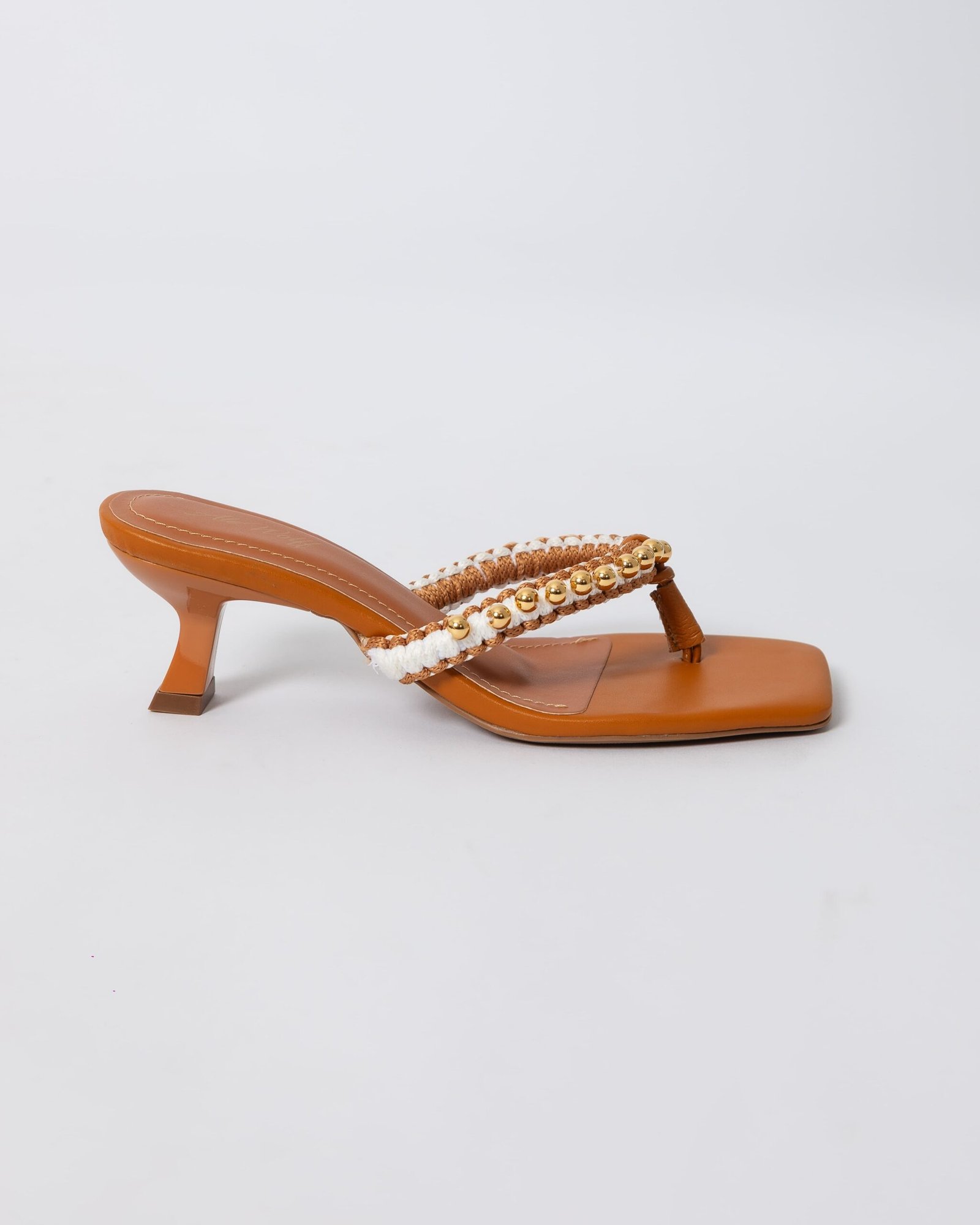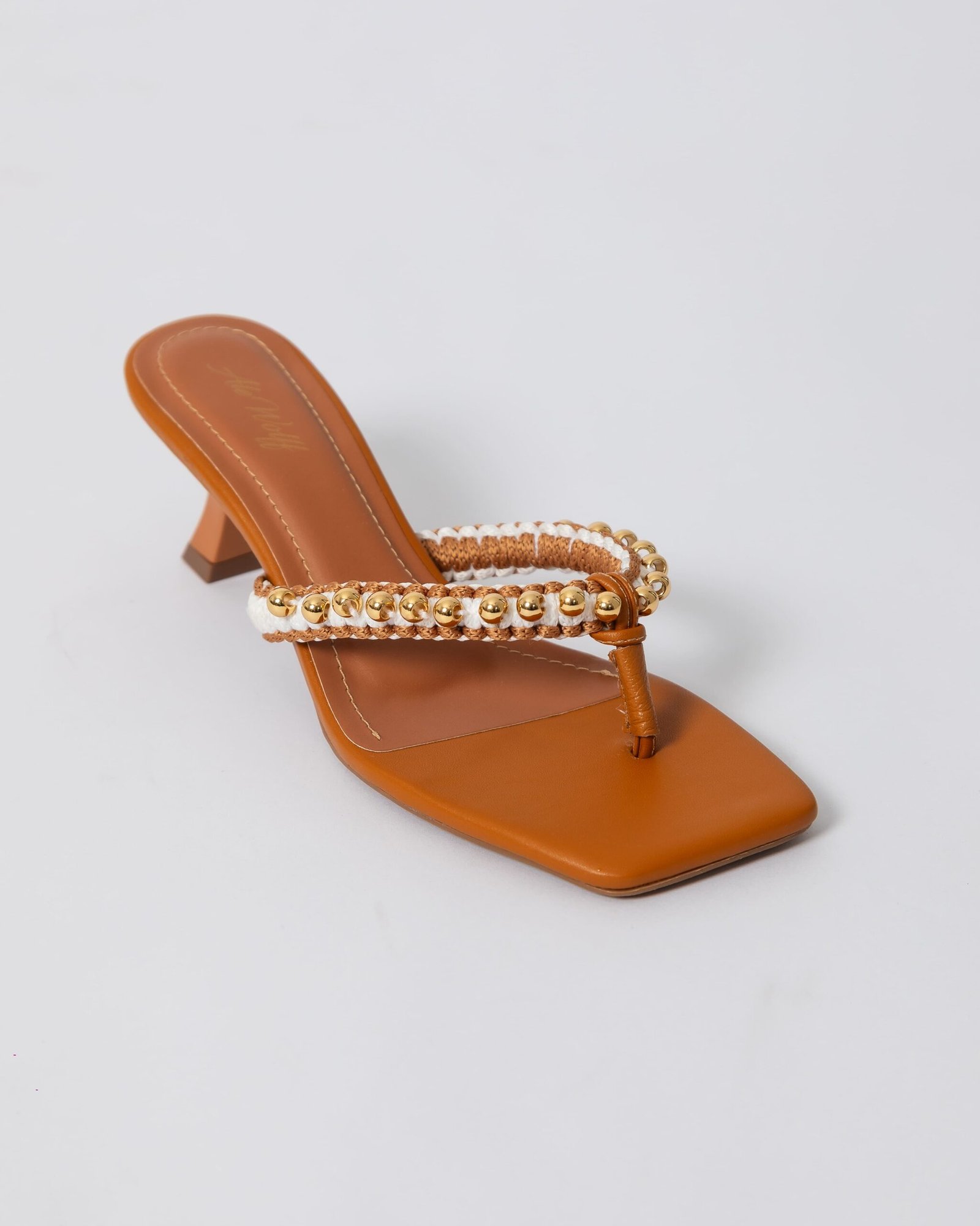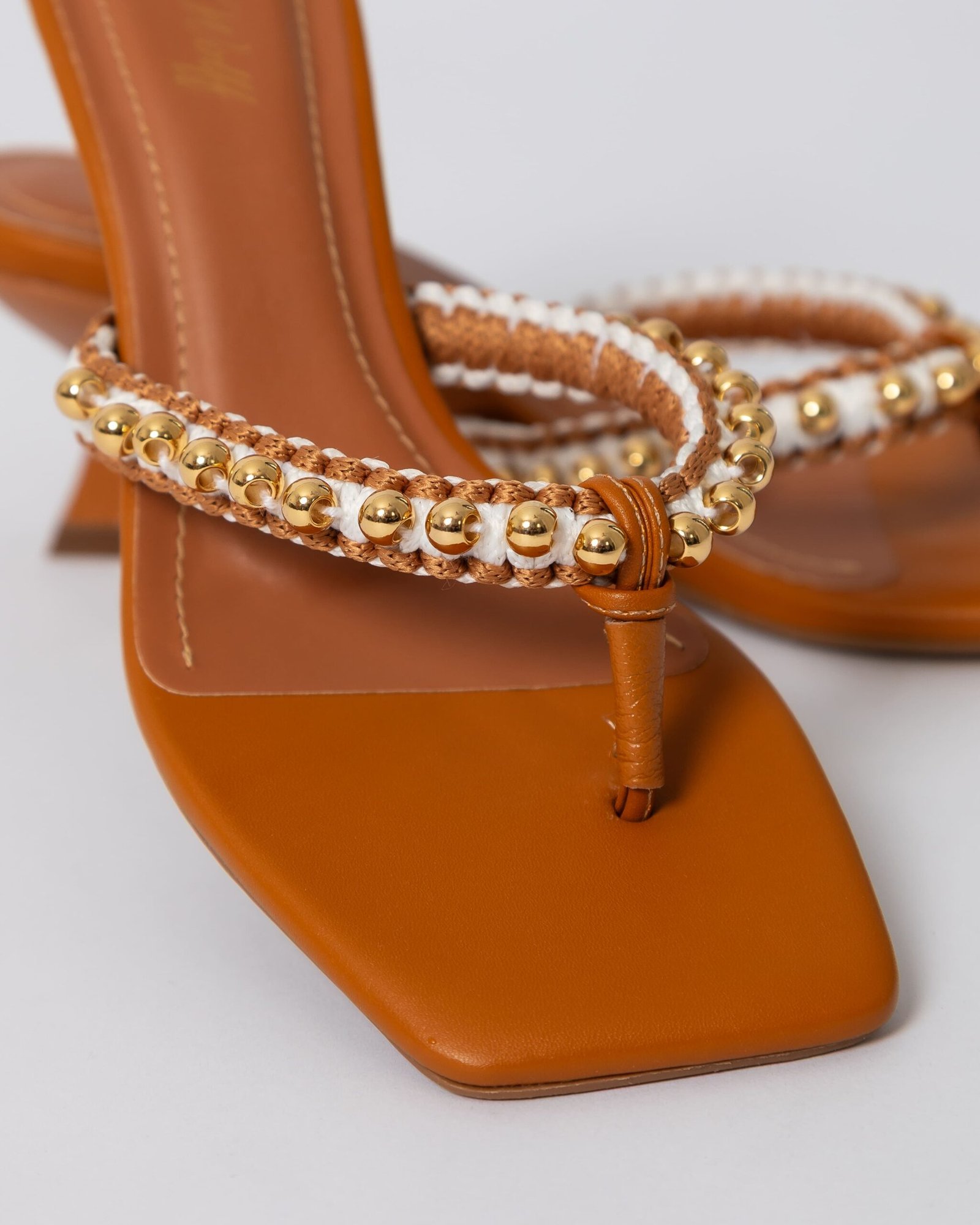 Sandália com salto pino na cor Carvalho , toda forrada no couro Carvalho, com gaspea bordada em macrame / handmade nos tons Carvalho e off white e aplicação de bolas em metal dourado