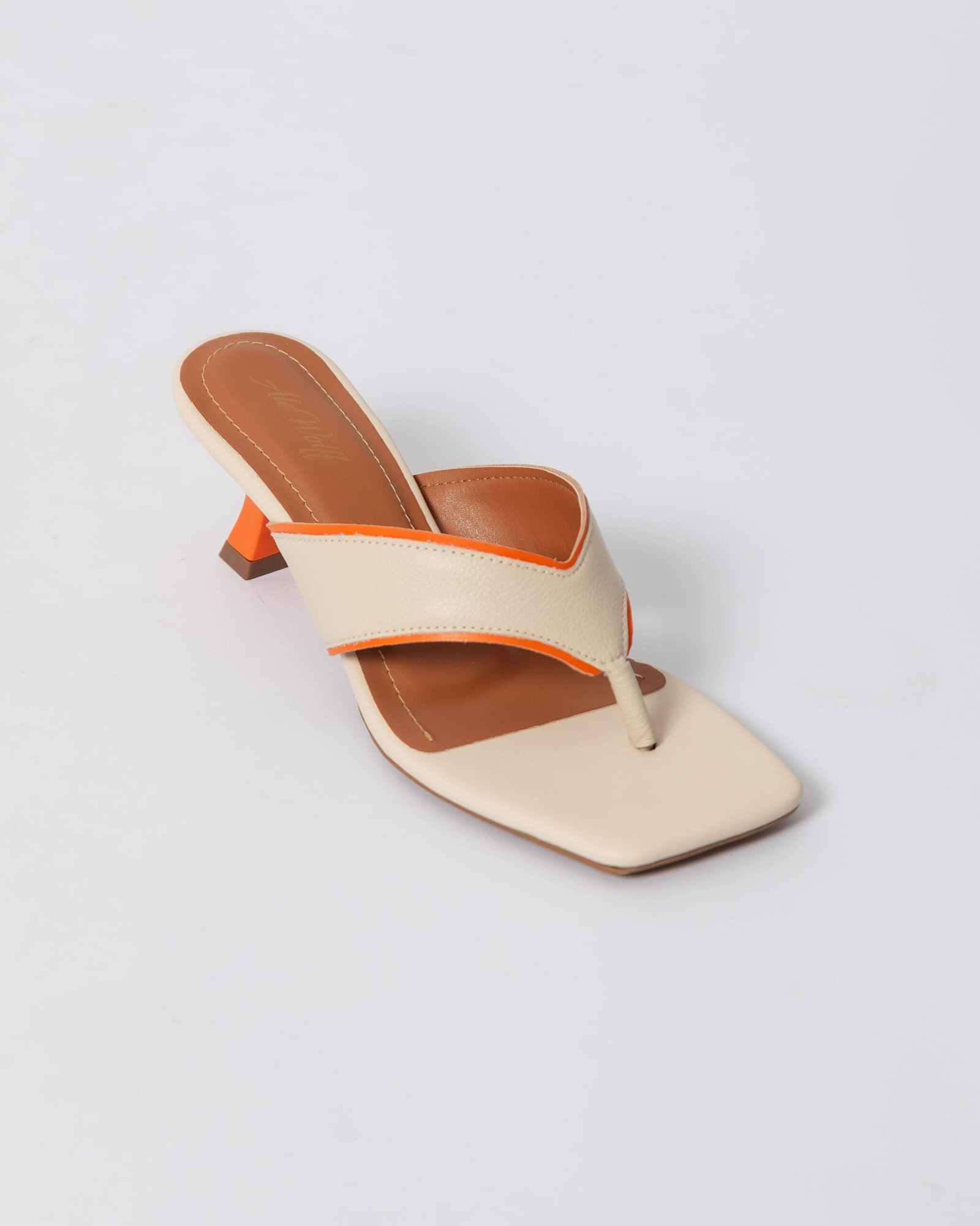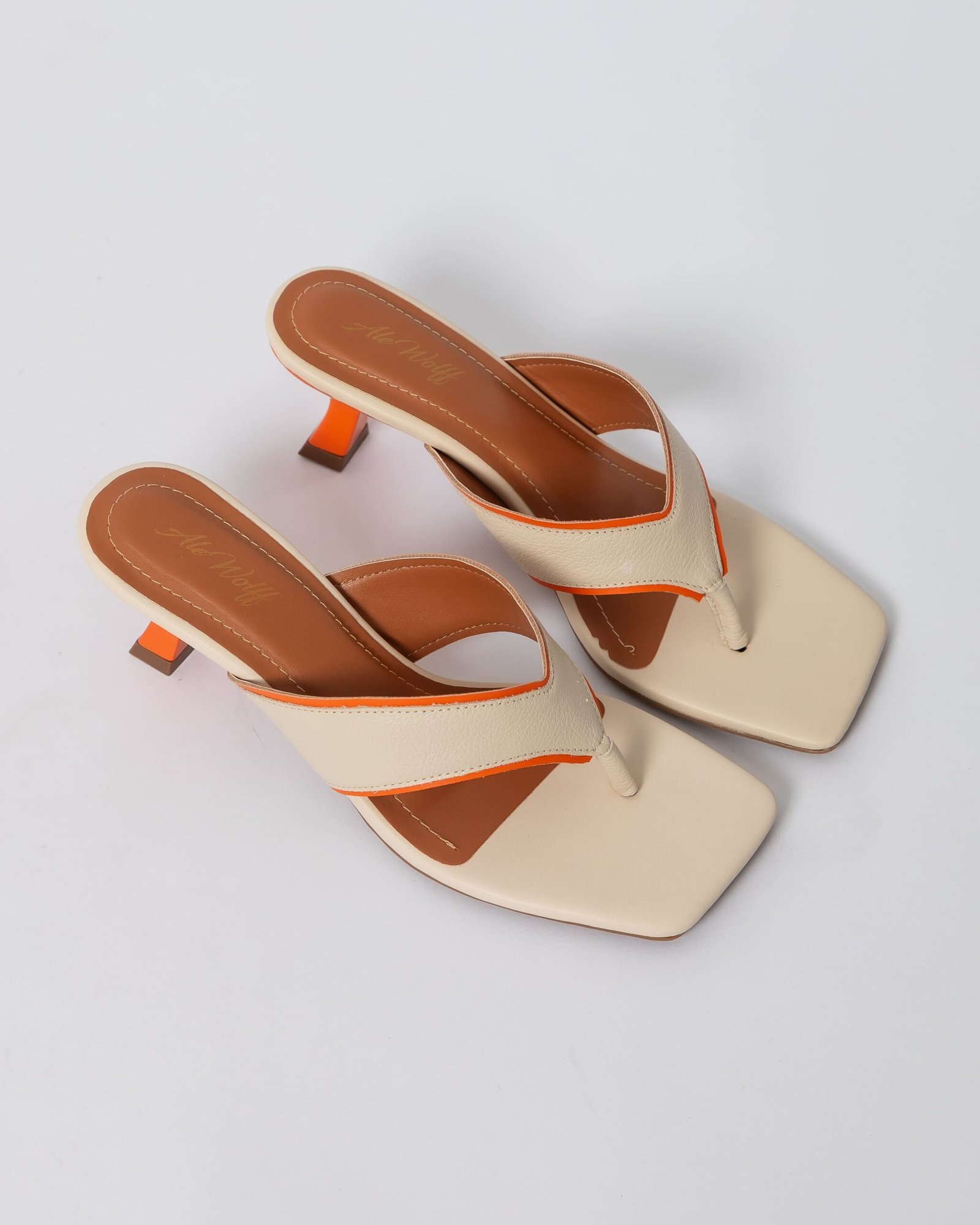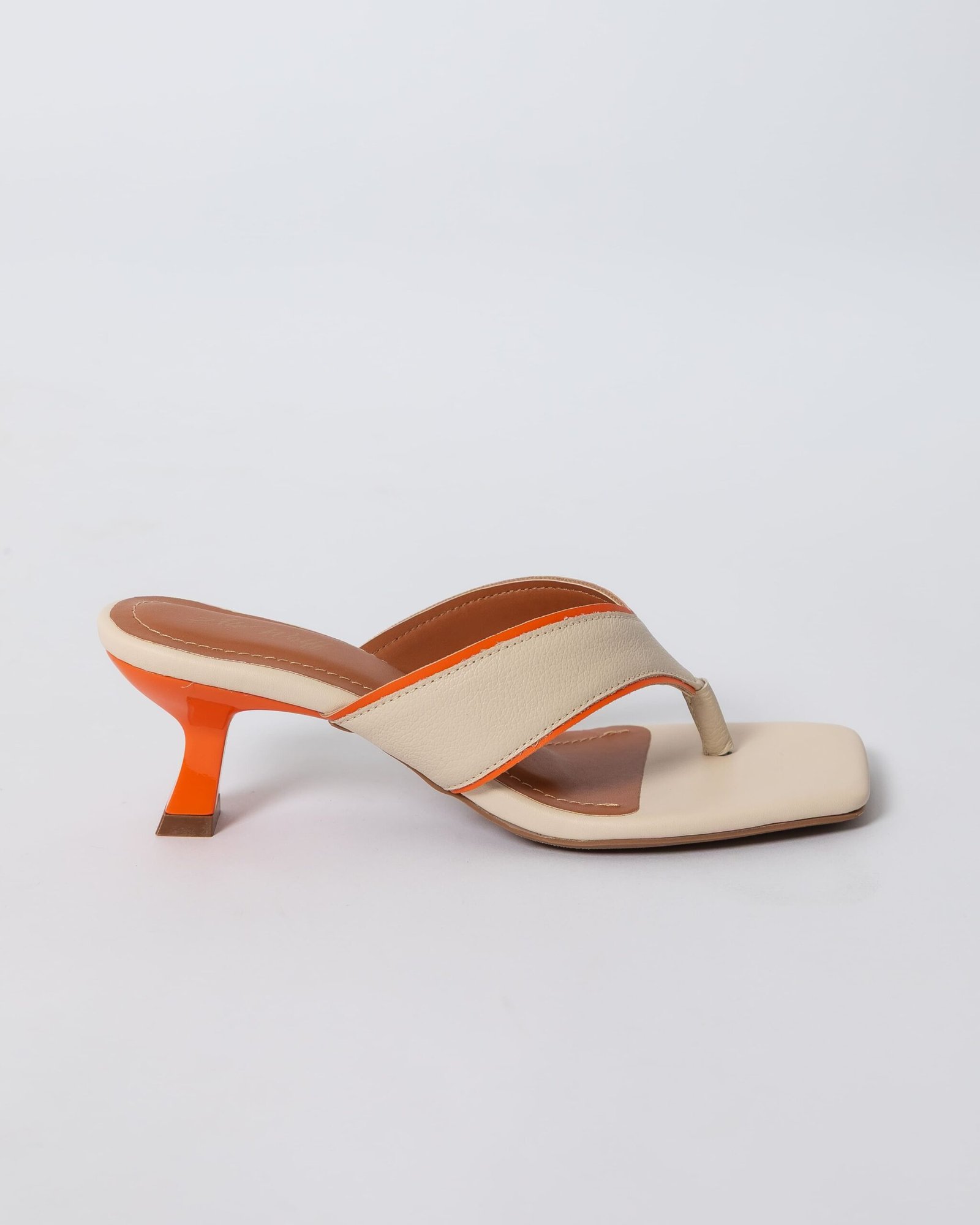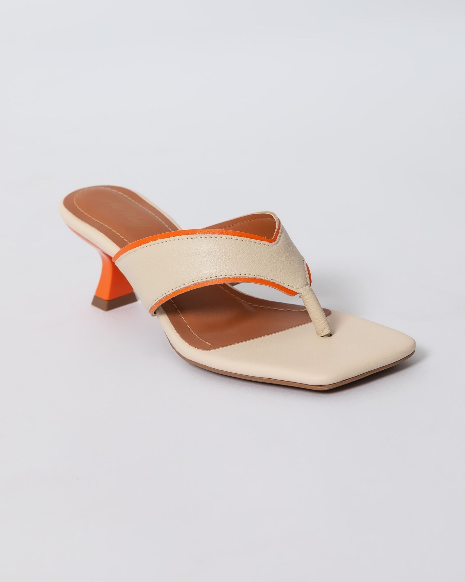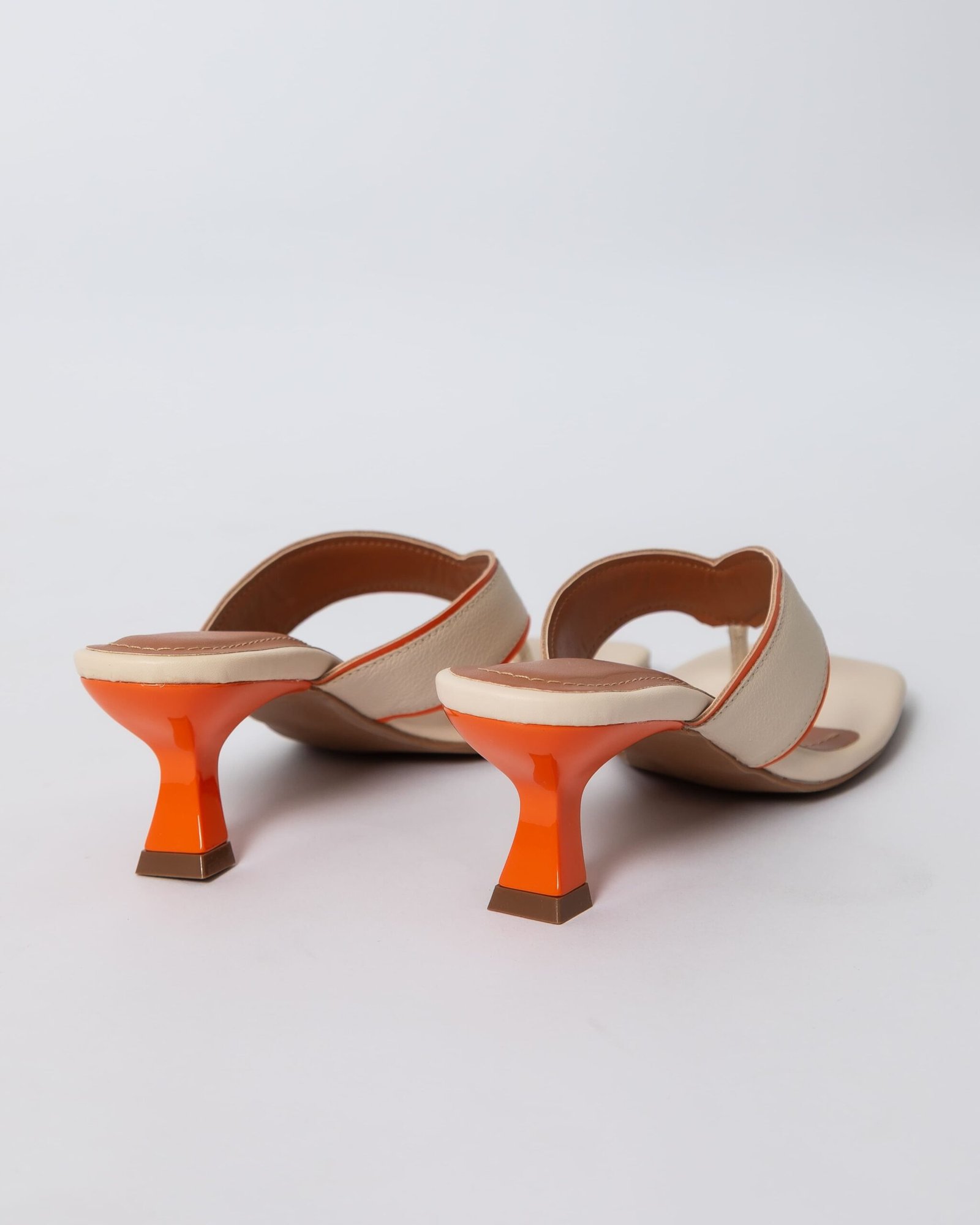 Sandália em salto pino na cor laranja , toda forrada em couro off white c viés em couro laranja .