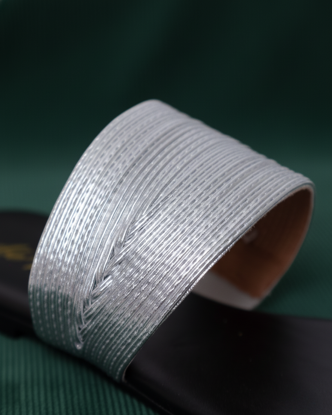 Sandália flat em couro preto (na palmilha) e prata (na gáspea – tiras costuradas uma a uma )