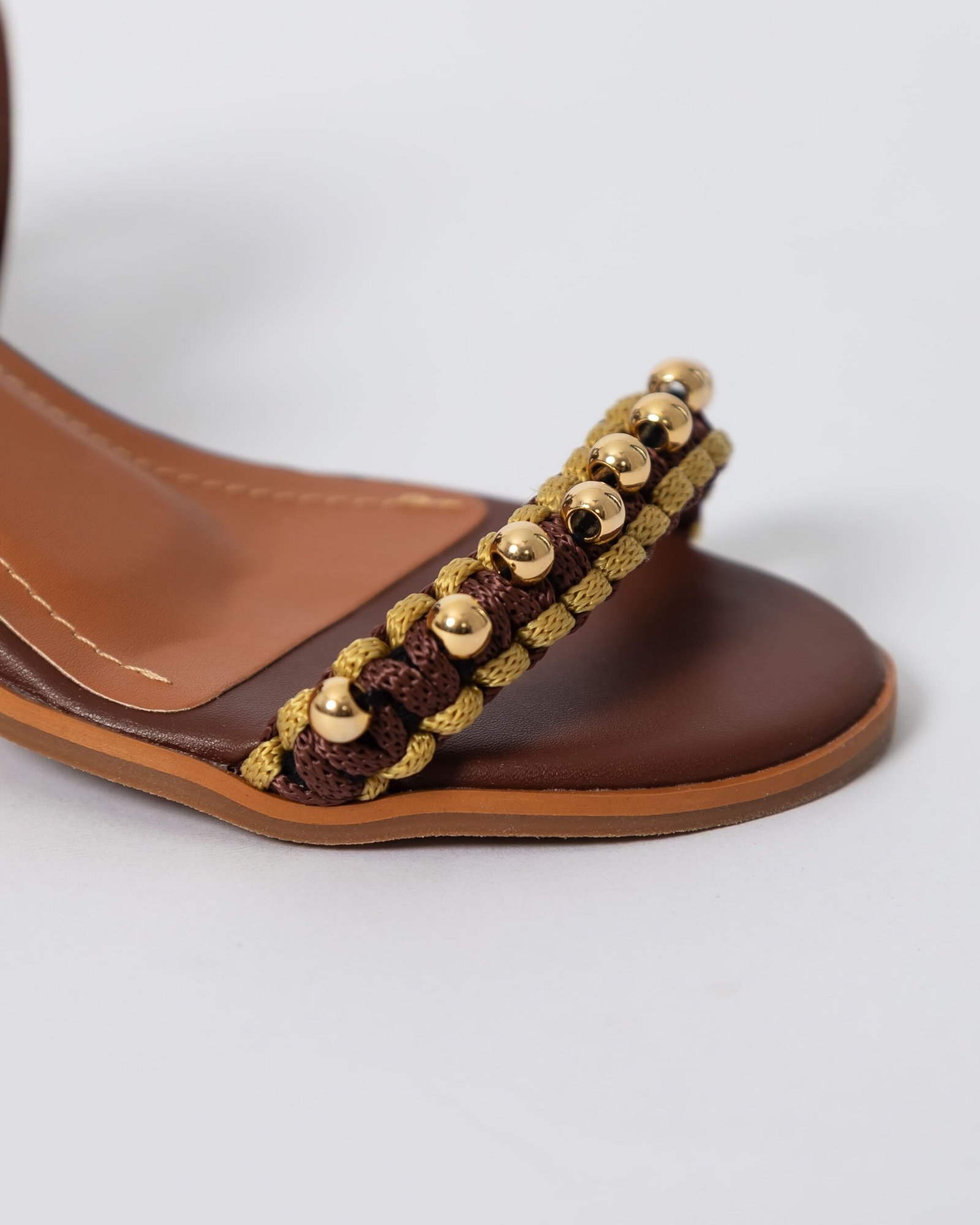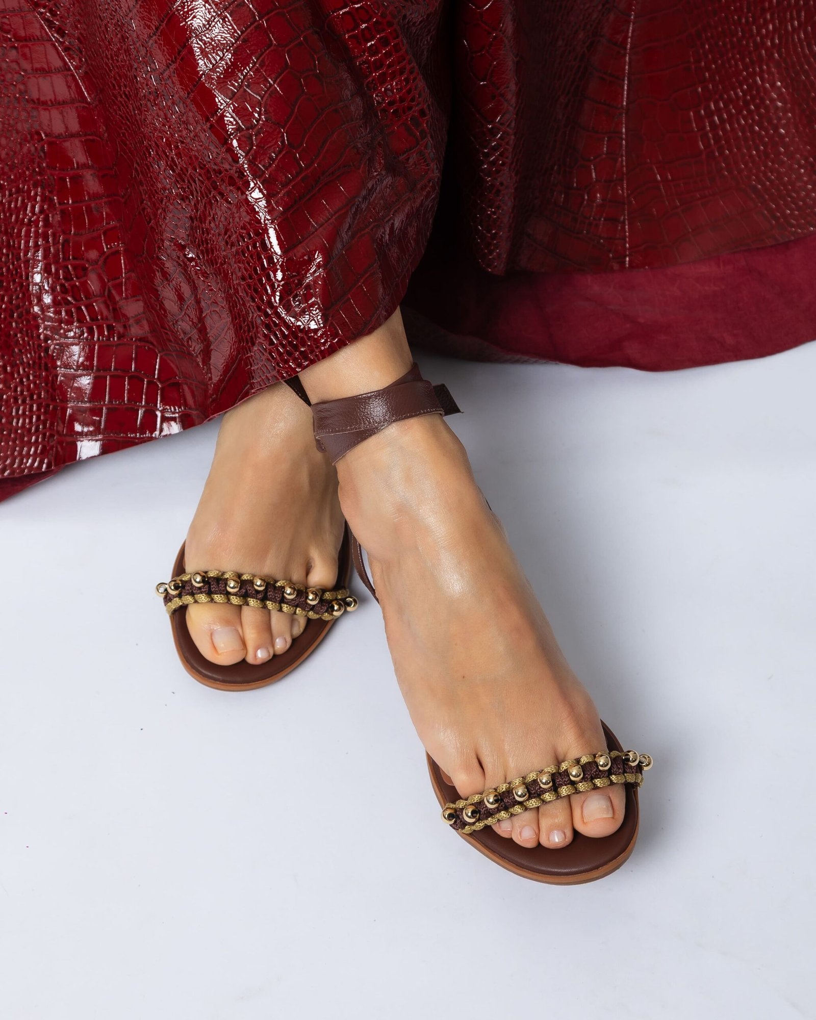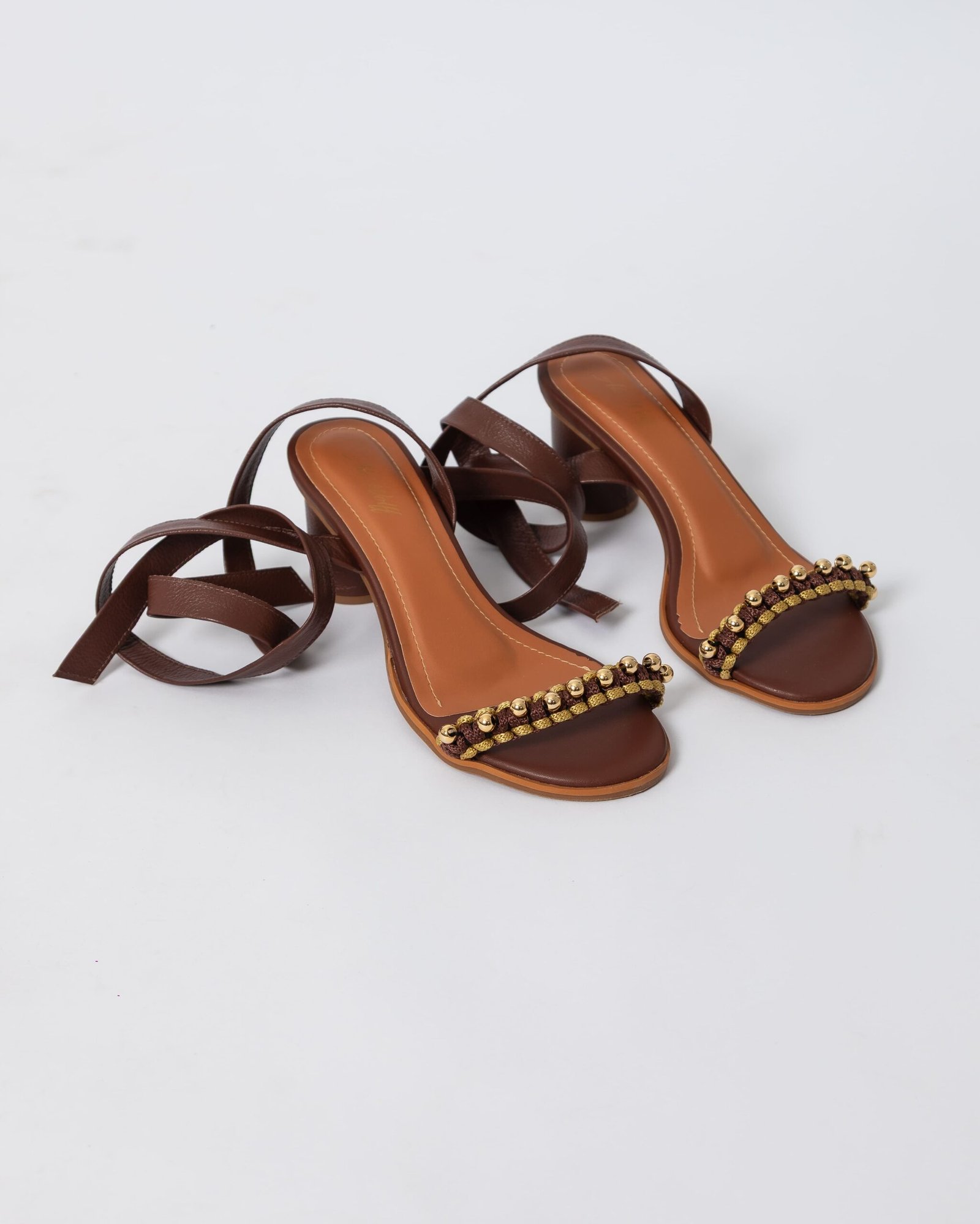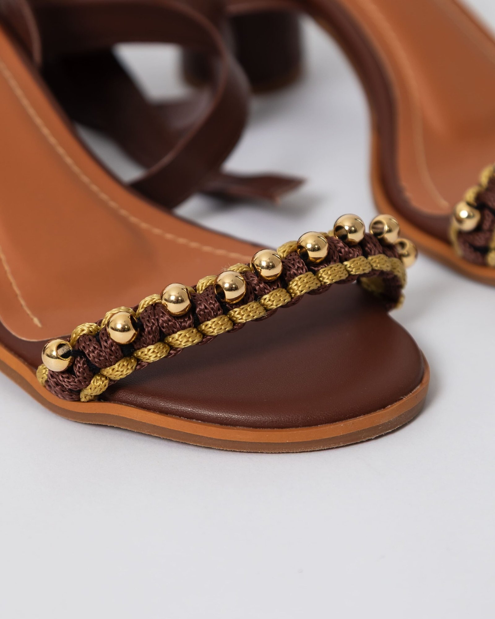 Sandália salto bloco em formato cilindro , toda forrada no couro marrom com gáspea bordada em macrame / handmade nas cores marrom e dourado , com aplicação de bolas em metal dourado .