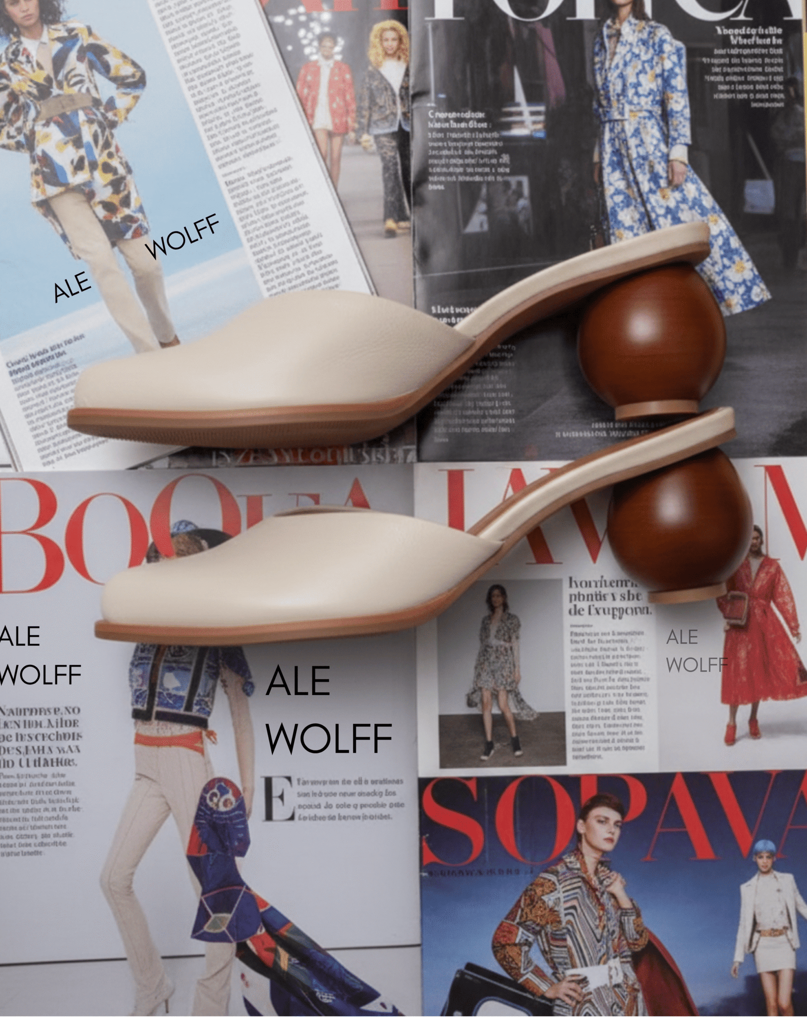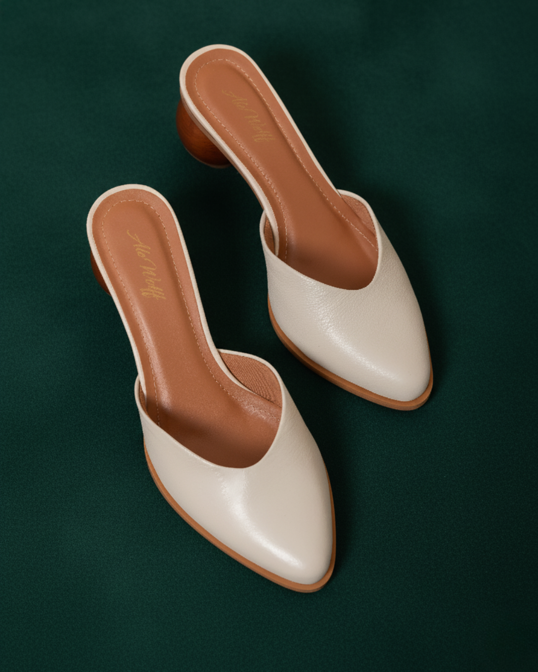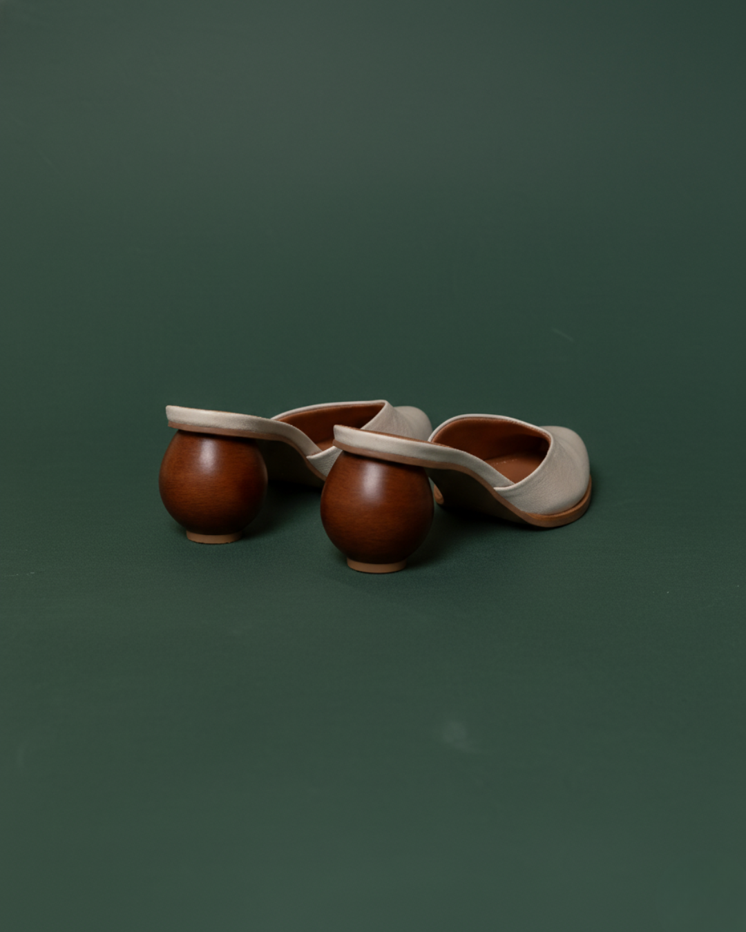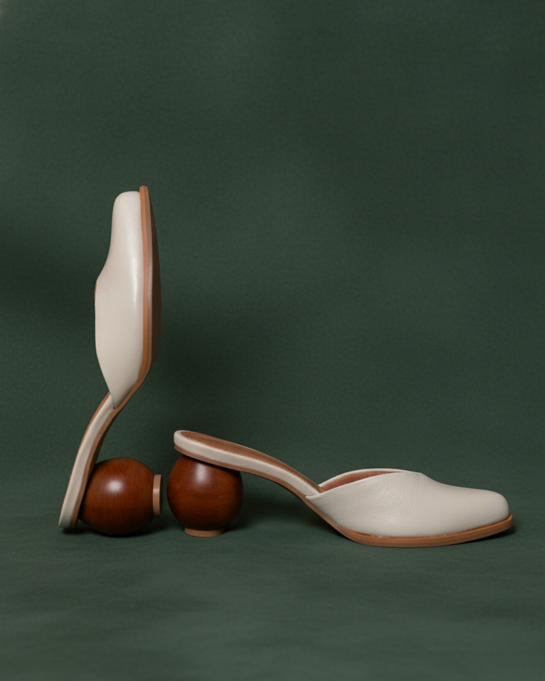 Sandália Mule/Sarcarpin em couro na cor off white com salto bola em madeira ( 5cms) na cor madeira .