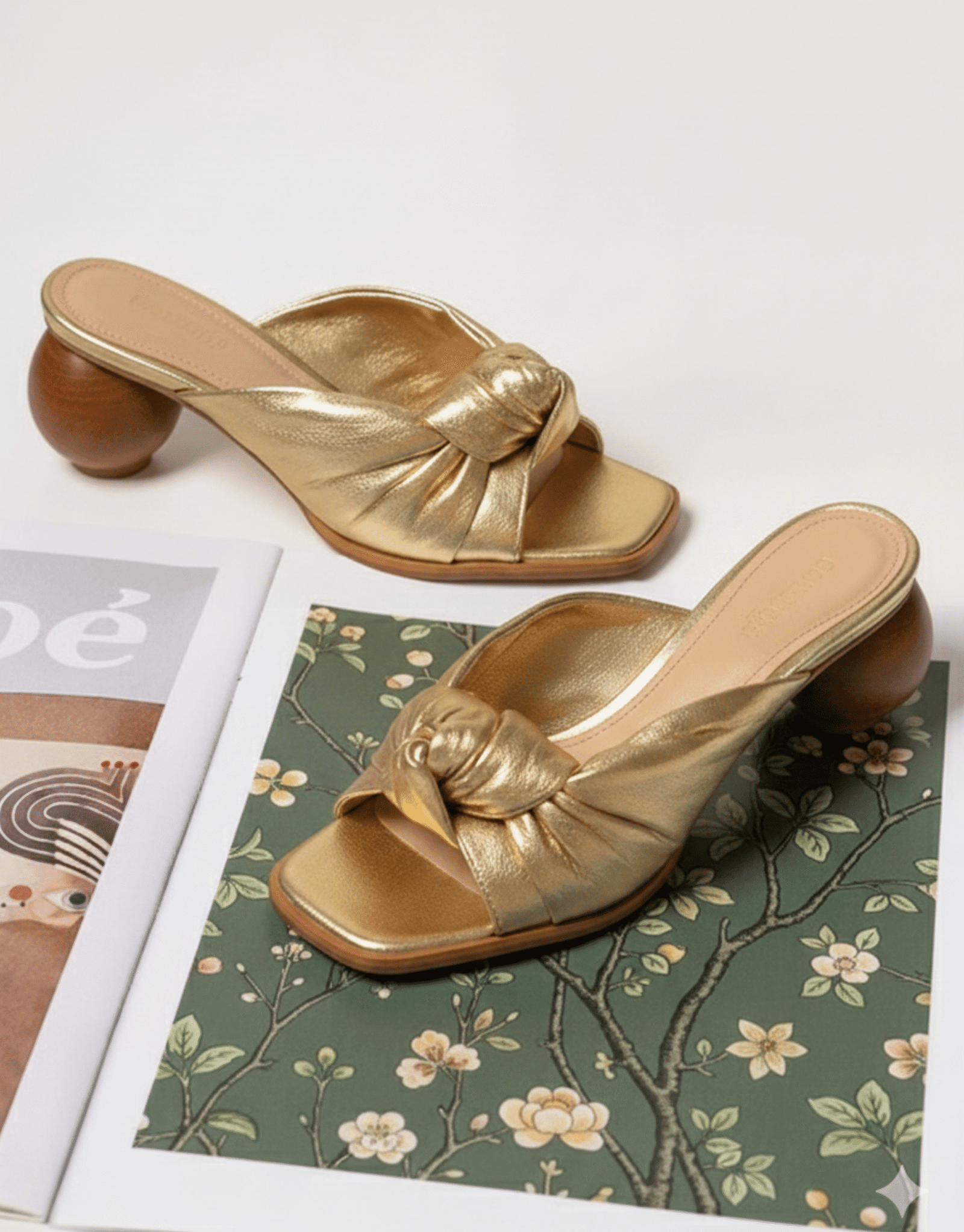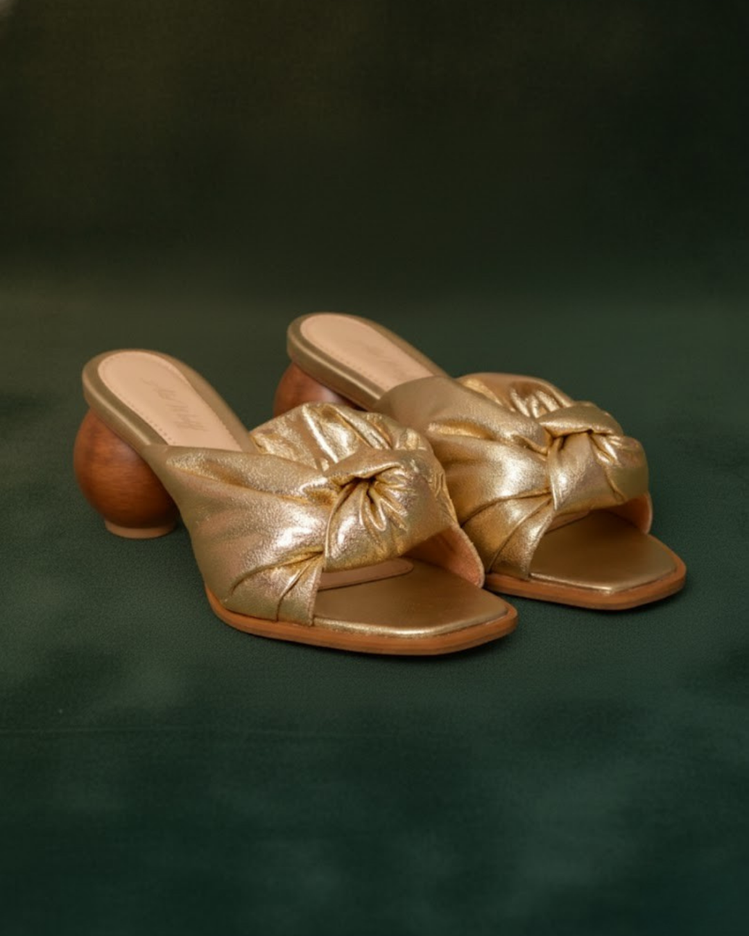 Sandália salto bola (5cms ) em madeira na cor madeira com gáspea em couro metalizado na cor ouro light e detalhe da gáspea em formato de nó .